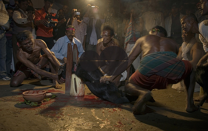 Goats are sacrificed from midnight till early morning at Tildanga, Chalna, Khulna, on the annual festival of Kalipuja. About 300 goats are sacrificed to satisfy Goddess Kali. A one day long fair takes place on the day of sacrifice. This traditional festival is a significant religious event for the villagers around Sundarban and southern part of Bangladesh. February 19, 2008.