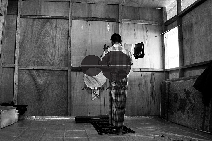 Mukhtar praying in his room. He is one of the thousands who survived the tsunami that hit Southeast Asia on December 26, 2004. Part of a feature essay, 'A Leg to Stand On'. Lhoknga, Aceh Besar, Indonesia. August 20, 2006.