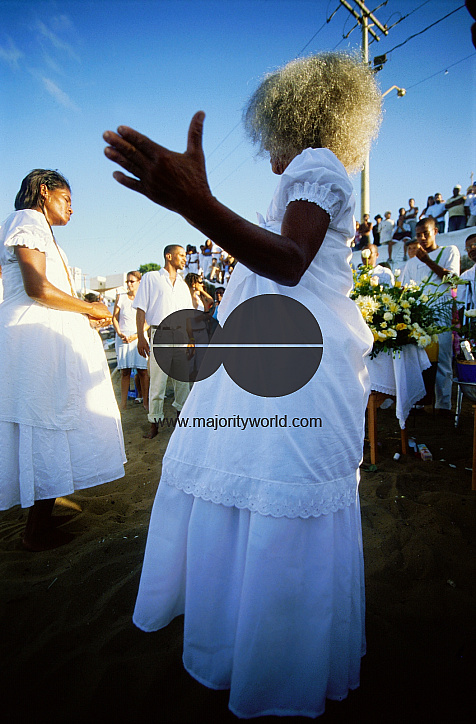 Chanting and singing on the beach as the celebrations begin.On February 2, the city of Salvador, Bahia, celebrates the sea goddess Iemanja, casting offerings into the sea at Rio Vermelho beach. Salvador, Brazil. February 2, 2008.
