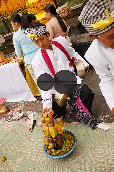 A musician taking sacred offerings in front of the altar of Saraswati Goddess in Cetho Temple, commemorating Saraswati Day - a day that knowledge entered mankind. Central Java, Indonesia. June 6, 2008.