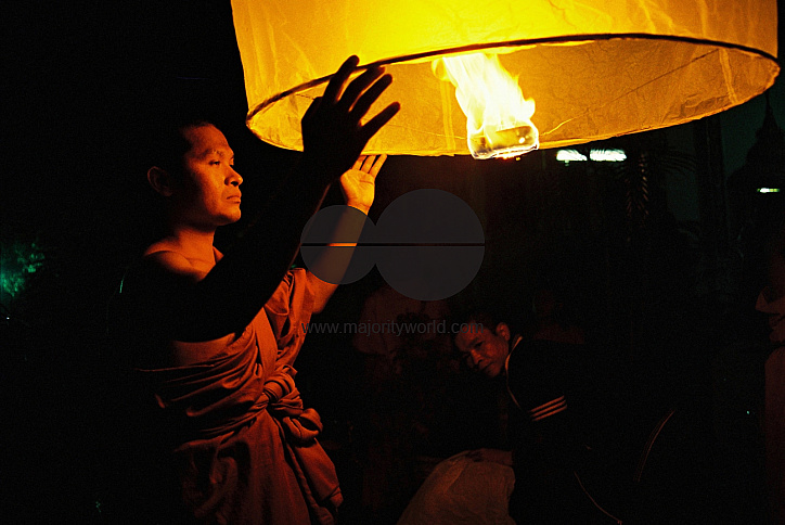 Monks send lanterns floating into the sky, a metaphoric gesture of sending the abbot’s spirit into the heavens above. Lampang, Thailand. July 11, 2000.