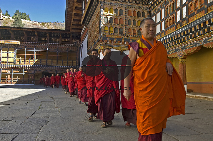 The master leading his students to the classroom, at the Rinpung Dzong, a fortress-monastery overlooking the Paro valley, in Paro, Bhutan. November 20, 2007.