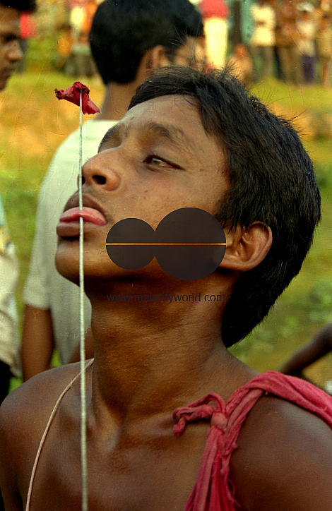 The Charak Puja held on the last days of the Bengali month Chaitra (April), is well-known for its rites of body piercing and swirling from a high pole. A charhak tree consisting of a long pole with a wheel fixed at the top, is erected. A devotee hangs from this wheel with a hook. The wheel is then spun around with him at high speed. He pierces his body including his tongue with small nails, at times red hot ones. The devotee thus spinning spreads Prasad, handmade sweetmeats blessed with chants, among the curious spectators and onlookers. The root of this ritual lies in the belief in spirits and the cult of rebirth. Its rites suggest ancient ritual of human sacrifice.