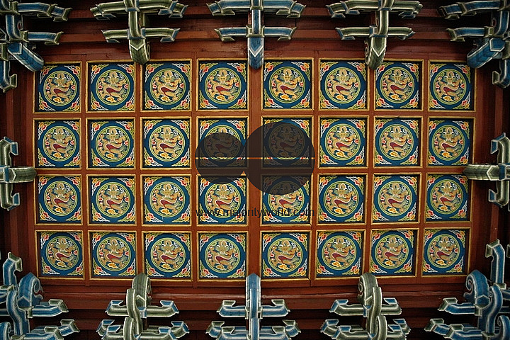 Intricate work done on the wooden ceiling with Buddhist inscriptions. Gandan Monastery is one of the most significant ones in Mongolia. UB, Ulaan Baator, Mongolia.