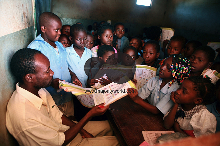 Children at Montes Namuli Primary School in Gurue crowd around their teacher to have their work marked. Gurue, Zambezia Province, Mozambique. March 10, 2010..