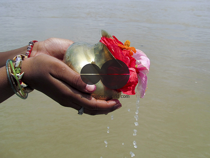 Varanasi, India. Hands of Indian woman holding a copper bowl filled with flower to conduct worshipping ritual on the border of the holy Ganges river. September 2011