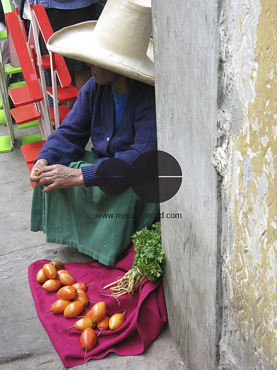 Cajamarca, Peru. Andean woman wearing a sombrero has selling her agricultural products on the streets of Cajamarca to make a living. August, 2010