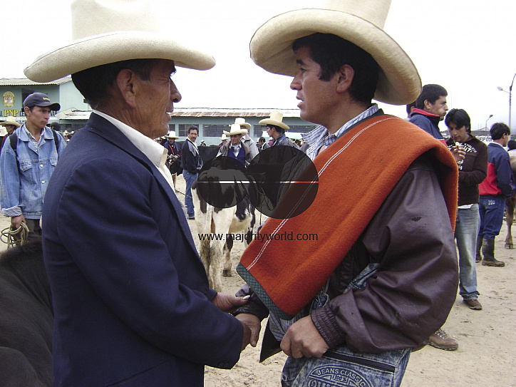 Celendin, Peru. Two Peruvian men with sombreros on closing the sale of a cow on Celendin's weekly animal market in the Peruvian Andes. June 2007