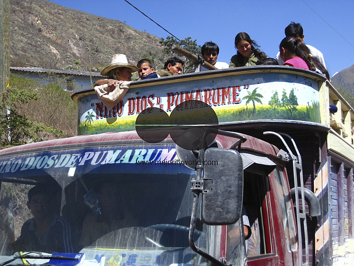 Celendin, Peru. People sitting on top of truck to get to the market. In the Andes many villages aren't reached by public transport so the inhabitants are dependant on trucks for their transportation. July 2010
