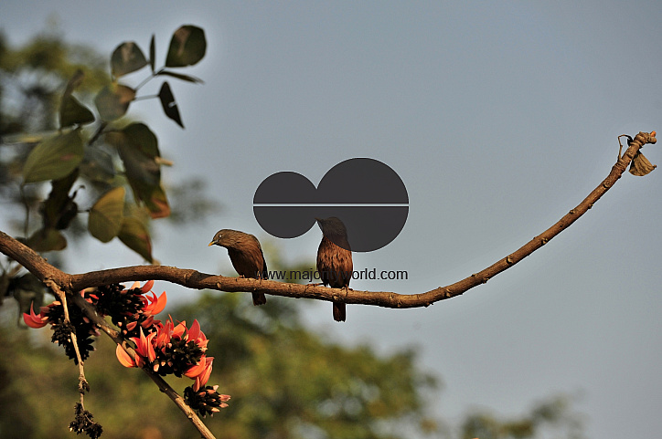 A pair of Greyheaded Mynas, locally known as Katth Shalik (Sturnus malabaricus) perched on the branch of a Palash tree, in Dhaka, Bangladesh. February 27, 2011.