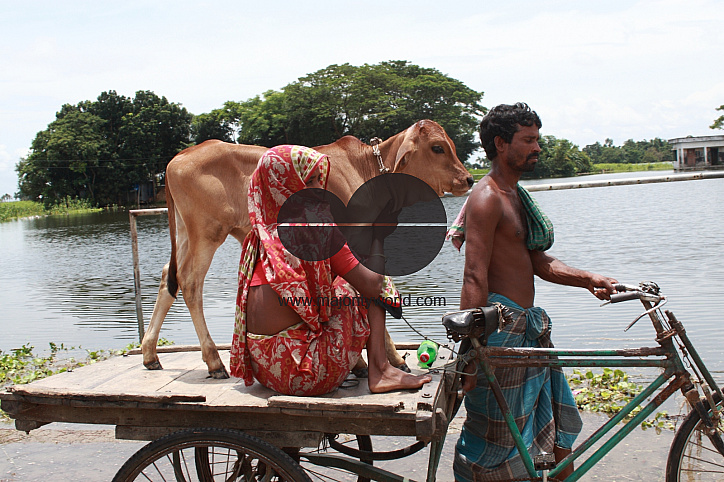 A woman carries a calf on a rickshaw van, through a flooded road in Sirajganj. Nearly 0.7 million people of the northern district have been affected by the severe flood of 2007. Sirajganj, Bangladesh. July 30, 2007.