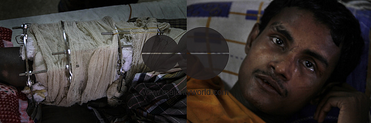 26-year-old Sheikh Liton broke his leg when a speeding truck hit his rickshaw van in Jessore. Probably I shall never be able to pull the rickshaw van again. I wish the government had provided loans and trainings for the handicaps so that they could survive by earning a livelihood. Monirampur, Jessore, Bangladesh. August 28, 2011. One of a set of images from the Photo Story, Tears on Highways, by Noor Alam.