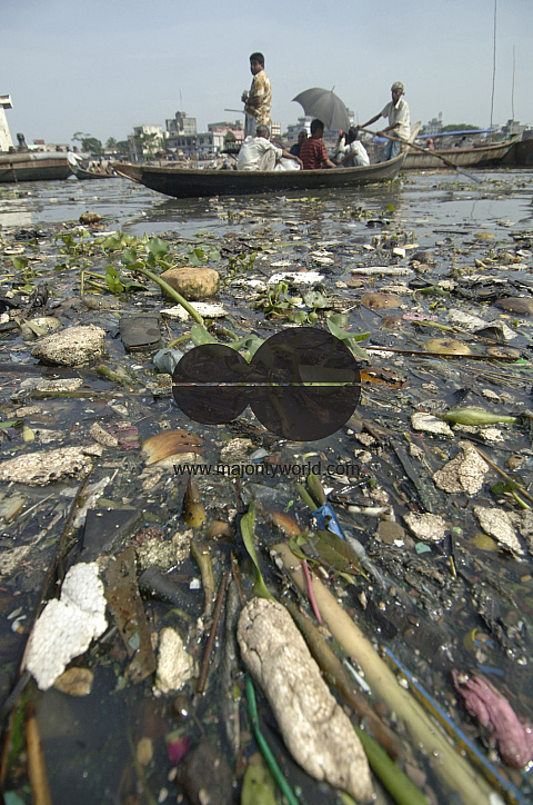 The Buriganga river inflicted with litters from Dhaka city. According to the Department of the Environment (DoE), about 4500 tons of solid waste from city dwellers and 20,000 tons of tannery waste, including some highly toxic materials are released into t