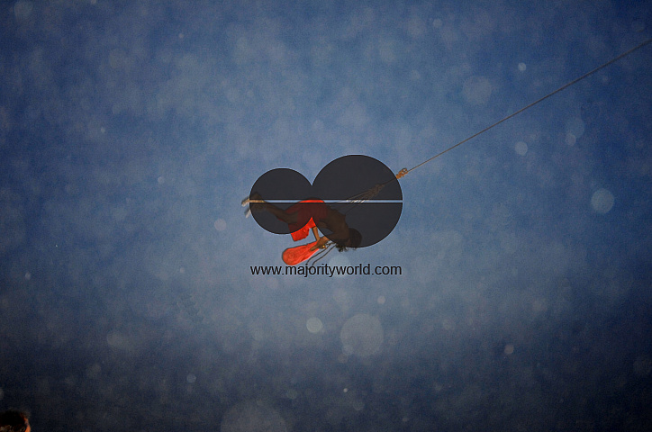 An ascetic devotee hangs from a spinning wheel attached with 'Charhak tree' on the occasion of Charak Puja at Shah Para village, Tangail, Bangladesh on April 2006..Charhak Puja is observed on the last days of the Bangla month of Chaitra (April) called Chatitra Sangkranti. Farmers celebrate during this festival with the devotees singing and dancing without any care. The Charak Puja is well-known for the rites of piercing the body with nails, and swirling from a high pole. A 'charhak tree' is built on the occasion, consisting of a long pole atop which a wheel is fixed. An ascetic devotee is hung from this wheel with a hook. The wheel then spins around with him at high speed. Small nails, at times red hot ones, pierce all parts of his body including his tongue. The devotee thus spinning spreads prasad (handmade sweetmeats blessed with chants) among the curious spectators and onlookers. .At the root of the celebration of Charhak Puja is a belief in spirits and the cult of rebirth. Its rites suggest ancient ritual of human sacrifice.