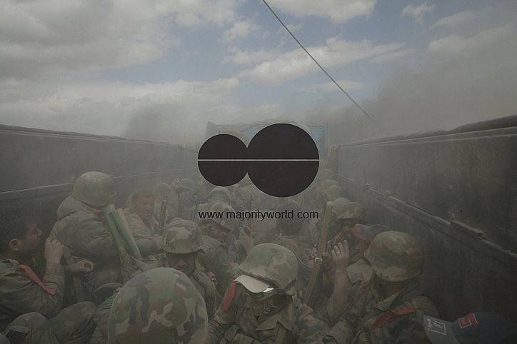 Some of the Syrian army in Daraa city in southwestern Syria were sitting behind the truck. The dust around the truck from enemy mortars hit near the truck. The enemy tries to blow up a truck carrying soldiers with mortars. on April16 /2013. Photo by: Hassan Ghaedi