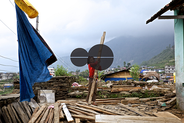 Ward 9, Barpak, Gorkha, Nepal. 11 years old Manju Gurung is helping her father and brother with rebuilding a new temporary shelter for their family..Like most other families, Manju's family has also lost their home in the terrifying earthquake. .This lit