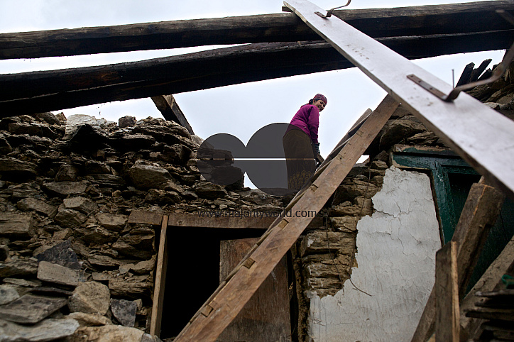 Barpak Village (Ward 7), Gorkha, Nepal. This woman clears the rubble in her house on her own with a smile on her face. She lost her home in the earthquake on April 25, 2015. .May 10, 2015.