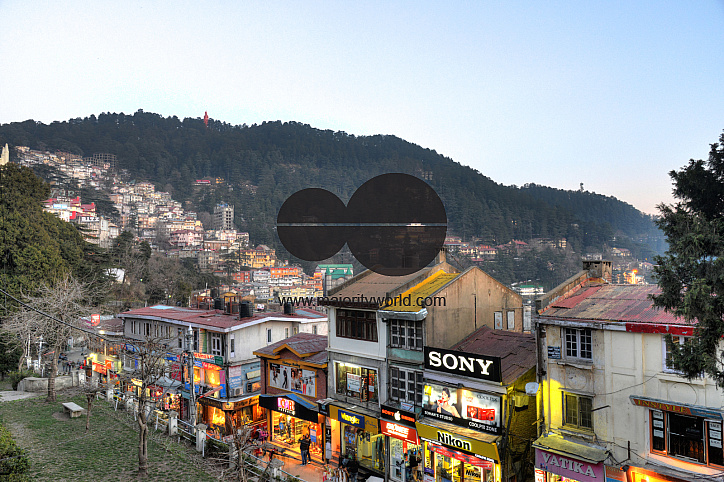 Row of shops in the evening at The Mall Road, Shimla..Shimla is the capital city of the Indian state of Himachal Pradesh, located in northern India at an elevation of 7,200 ft. Due to its weather and view it attracts many tourists. It is also the former c