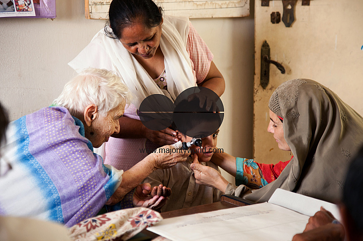 Dr. Ruth Pfau observing a young patient who suffers from mental disabilities. The mother of the child is seen trying to coax her son to allow Dr.Pfau to complete the check-up.