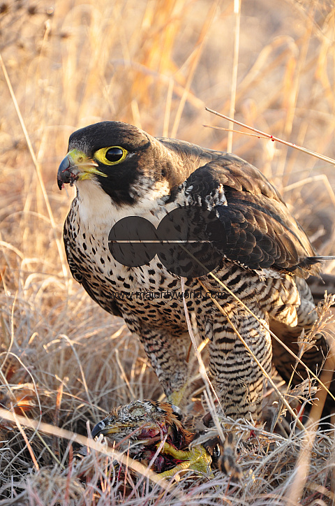 A female peregrine falcon (Falco Peregrinus) with its prey. Also known as the Peregrine, Peregrines are found nearly everywhere on earth, except extreme polar regions, very high mountains, and most tropical rainforests. They can reach speeds over 365 km/h (200 mph) in a dive, making them the fastest animal in the world. Trained falcons are used in falconry or hawking, a sport in which birds of prey are used to hunt or catch game. Falconry is over 4000 years old and has had a rich history throughout the ages from the ancient Chinese to the Egyptians and even European Royalty. Free State, South Africa. 13.07.2009.