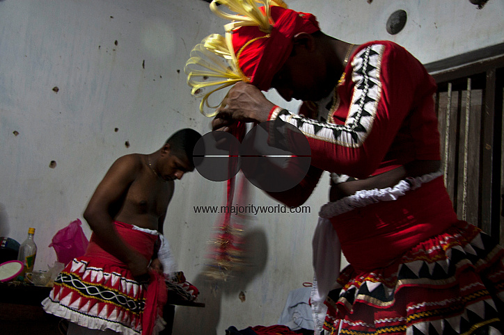 The traditional Gam-maduwa or village hut ceremony, usually held after the harvest of crops, is dedicated to Goddess Pattini, the most popular south Indian female deity worshiped by Sinhala Buddhists. It takes place in an enclosure surrounding a palm thatched hut. A portion of first harvested crop or fruit is offered to the Goddess for prosperity and to ward off misfortune and diseases. A gam-maduwa has many interludes dramatized mainly from rich legendary lore about the goddess Pattini. At present Gam-mduwa is held in rare occasions, therefore it draws visitors even from other villages. Mukalana, Colombo, Sri Lanka. August 12, 2007.