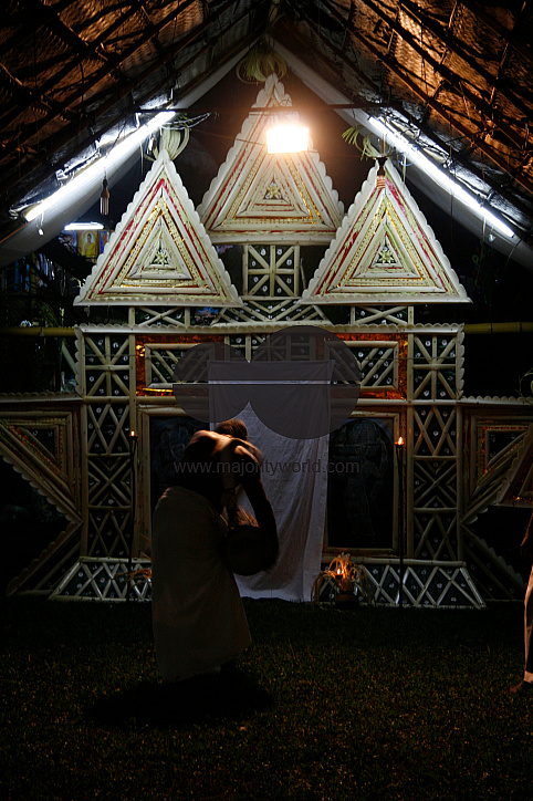 The traditional Gam-maduwa or village hut ceremony, usually held after the harvest of crops, is dedicated to Goddess Pattini, the most popular south Indian female deity worshiped by Sinhala Buddhists. It takes place in an enclosure surrounding a palm thatched hut. A portion of first harvested crop or fruit is offered to the Goddess for prosperity and to ward off misfortune and diseases. A gam-maduwa has many interludes dramatized mainly from rich legendary lore about the goddess Pattini. At present Gam-mduwa is held in rare occasions, therefore it draws visitors even from other villages. Mukalana, Colombo, Sri Lanka. August 12, 2007.