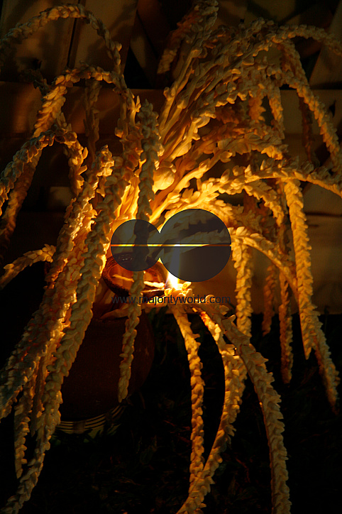 The traditional Gam-maduwa or village hut ceremony, usually held after the harvest of crops, is dedicated to Goddess Pattini, the most popular south Indian female deity worshiped by Sinhala Buddhists. It takes place in an enclosure surrounding a palm thatched hut. A portion of first harvested crop or fruit is offered to the Goddess for prosperity and to ward off misfortune and diseases. A gam-maduwa has many interludes dramatized mainly from rich legendary lore about the goddess Pattini. At present Gam-mduwa is held in rare occasions, therefore it draws visitors even from other villages. Mukalana, Colombo, Sri Lanka. August 12, 2007.
