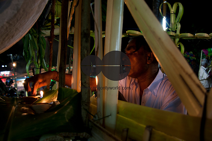 The traditional Gam-maduwa or village hut ceremony, usually held after the harvest of crops, is dedicated to Goddess Pattini, the most popular south Indian female deity worshiped by Sinhala Buddhists. It takes place in an enclosure surrounding a palm thatched hut. A portion of first harvested crop or fruit is offered to the Goddess for prosperity and to ward off misfortune and diseases. A gam-maduwa has many interludes dramatized mainly from rich legendary lore about the goddess Pattini. At present Gam-mduwa is held in rare occasions, therefore it draws visitors even from other villages. Mukalana, Colombo, Sri Lanka. August 12, 2007.
