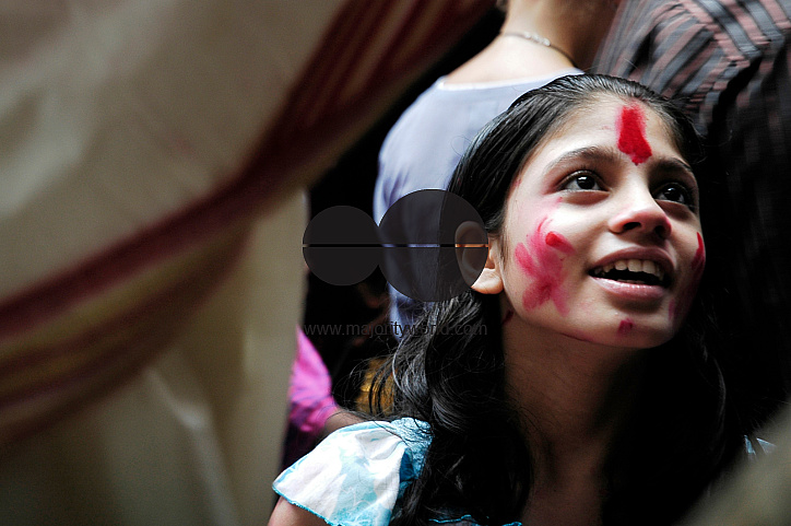 People from Hindu community celebrate the victory of Goddess Durga over Asuras (evil forces) on the day of Bijoya Dashami of Durga Puja festival, in Shakhari Bazaar, Old Dhaka. Durga Puja is one of the biggest festivals of Hindu community and widely observed throughout the country. Dhaka, Bangladesh. October 17, 2010.