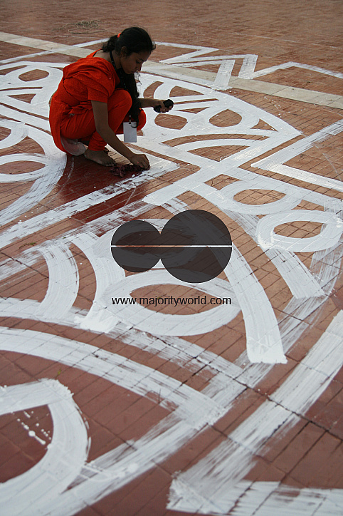 Students from the Institute of Fine Arts, Dhaka University, paint colorful designs locally known as alpona, on the pavement in front of Central Shaheed Minar (Martyr's Monument), ahead of the International Mother Language Day on 21st February 2011. Dhaka,