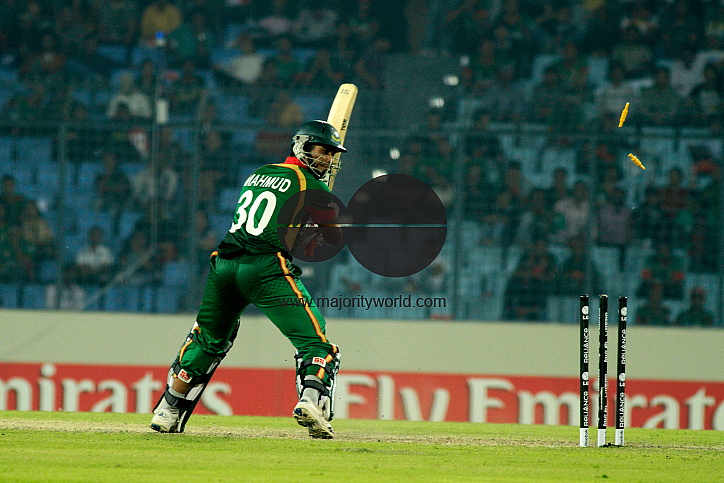 Bails fly as Mahmudullah of Bangladesh is clean bowled, at the Sher-e-Bangla National Stadium, Mirpur, on 19th February, 2011. Dhaka, Bangladesh.