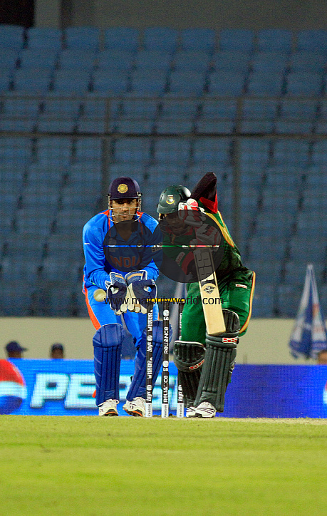 Mushfiqur Rahim of Bangladeshi cricket team bats during the opening match (India versus Bangladesh) of the ICC Cricket World Cup 2011, at Sher-e-Bangla National Stadium, Mirpur, on 19th February, 2011. Dhaka, Bangladesh.