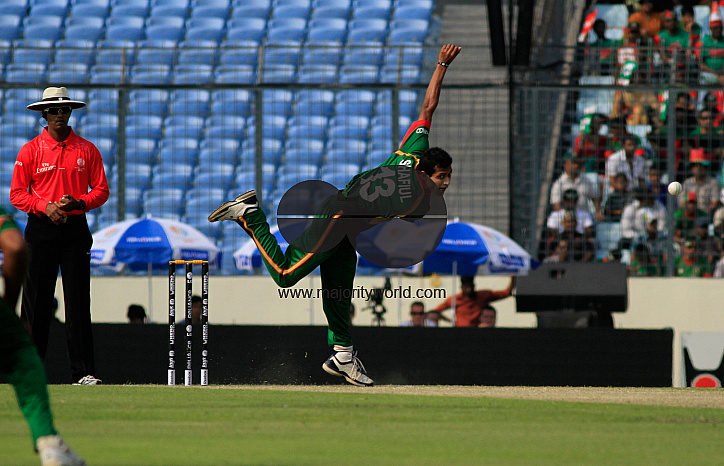 Bangladeshi cricketer Shafiul Islam bowls against the Indians, in the opening match of the ICC Cricket World Cup 2011, at Sher-e-Bangla National Stadium, Mirpur, on 19th February, 2011. Dhaka, Bangladesh.