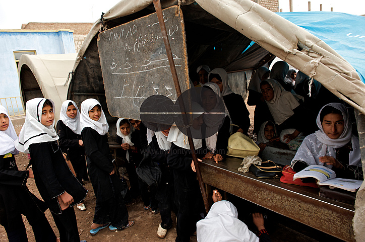 Children at the government run Pul-e-Rangeena Primary School, in the northwestern city of Herat, Afghanistan. May 6, 2009. Around 9000 children attend this school in three shifts. As a large number of children are returning to the school after years of conflict, it is difficult for the school management to house them all in proper classrooms and hundreds of children have to attend claases in the open.
