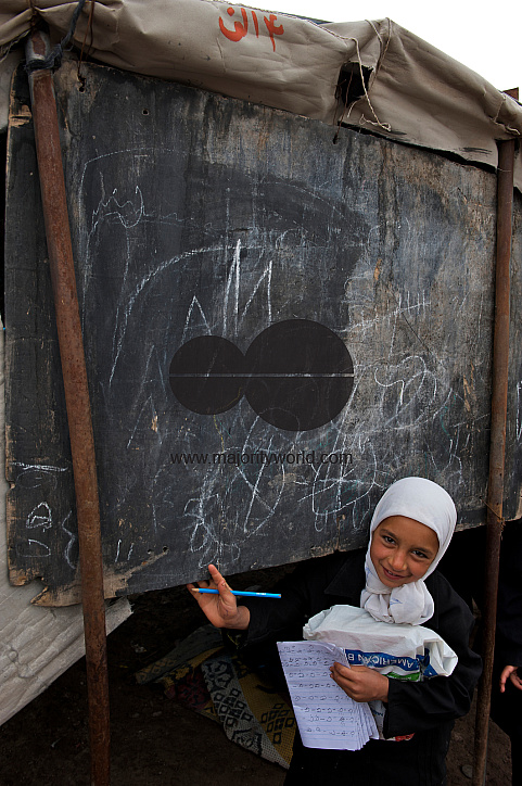 A child at the government run Pul-e-Rangeena Primary School for girls, in the northwestern city of Herat, Afghanistan. May 6, 2009. Around 9000 children attend this school in three shifts. As a large number of children are returning to the school after years of conflict, it is difficult for the school management to house them all in proper classrooms and hundreds of children have to attend claases in the open.