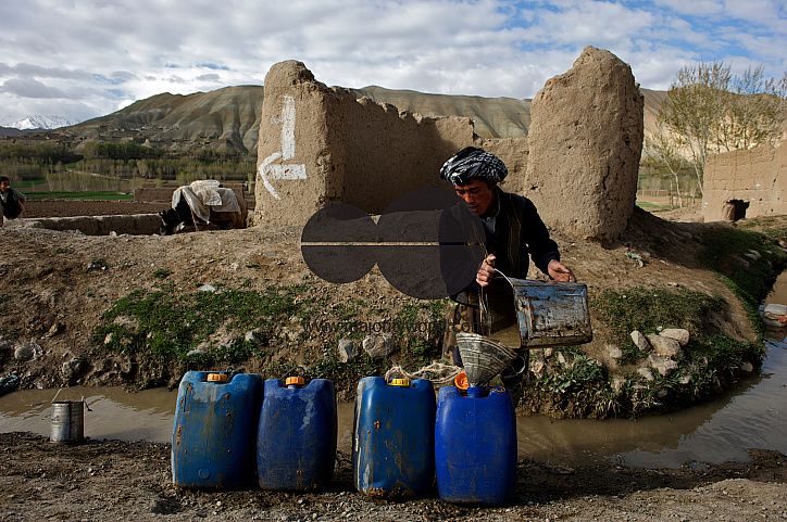 A man collects water from a stream, on the outskirts of Bamyan city, Bamyan province, Afghanistan. People have to walk miles to reach the streams to get water to meet their domestic needs. May 11, 2009.