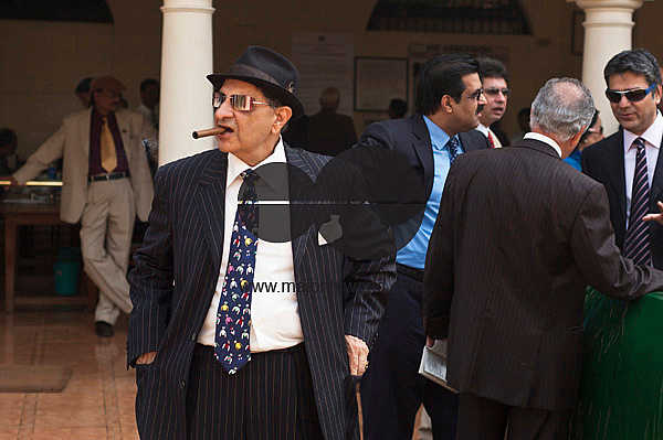 Mr Poonawalla smoking his cigar during Poonawalla Derby race. He is one of the many horse breeders and regulars at Bombay races at Mahalakshmi Race course in South Bombay