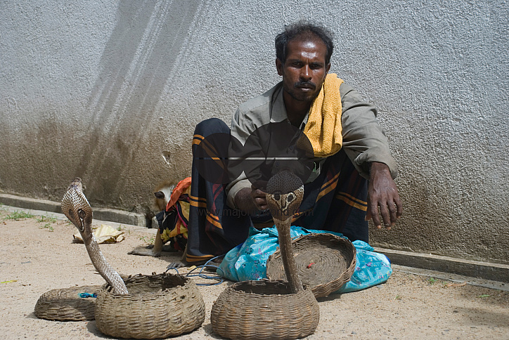 Model release no: 006.Anawattege S. Sinnasami, 39, a Snake Charmer with Snake and Monkey performs for audiences as they living by the earnings, August 16, 2008, in Colombo, Sri Lanka.