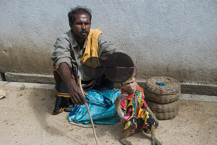 Model release no: 006.Anawattege S. Sinnasami, 39, a Snake Charmer with Snake and Monkey performs for audiences as they living by the earnings, August 16, 2008, in Colombo, Sri Lanka.