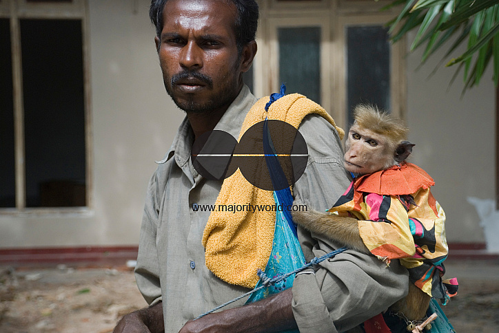 Model release no: 006.Anawattege S. Sinnasami, 39, a Snake Charmer with Snake and Monkey performs for audiences as they living by the earnings, August 16, 2008, in Colombo, Sri Lanka.