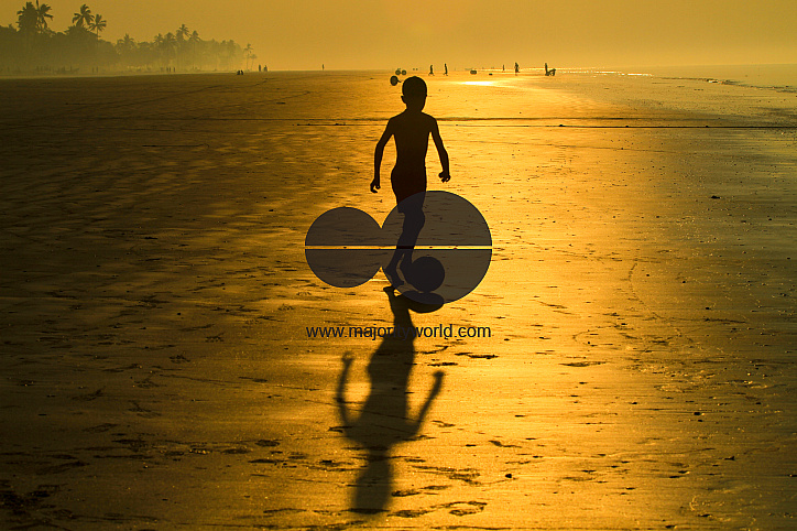 A young boy dribbles a football on Kuakata beach, early in the morning. This is one of the rare natural spots that offers a full view of the rising and setting sun over the Bay of Bengal. A popular tourist destination, it is about 320 kilometers South fr