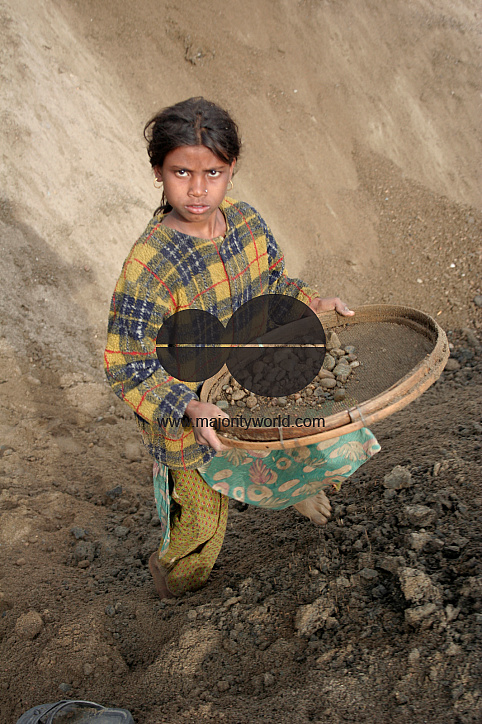 A girl sifts stones and pebbles from sand with a strainer, at a stone quarry on the bank of Dauki river, Sylhet, Bangladesh. January 18, 2010.
