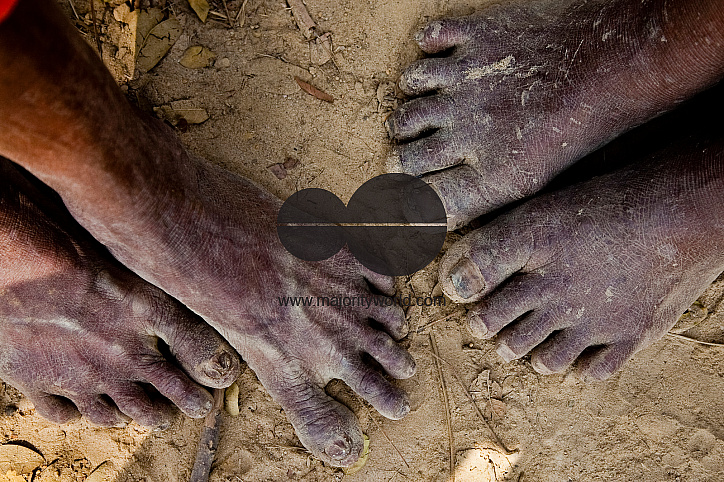Feet of barefoot workers riddled with fungus infections from the clay. The workers use razor blades to scrape off skin lesions as no medication is available to them.