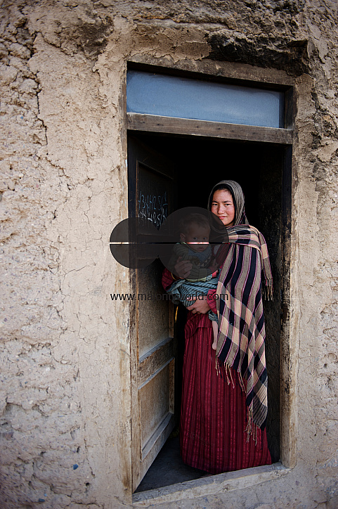 A girl carries a baby and stands at the doorway of her house in the village of Rag-e-shad on the outskirts of the city of Bamyan in the central Bamyan Province. Afghanistan. May 11, 2009.