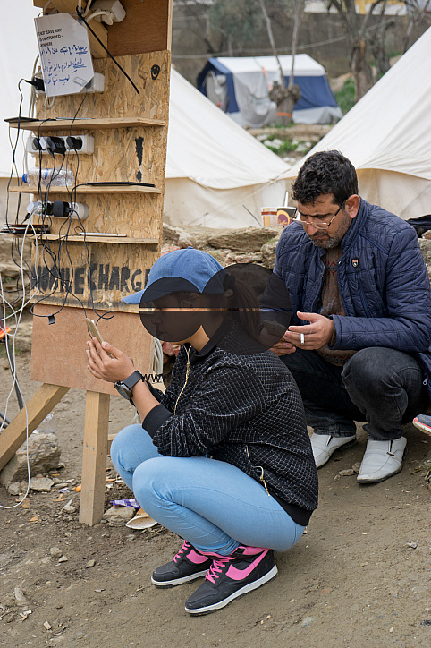 Refugees from Syria and Afghanistan charging their mobile phones at the Greek island of Lesbos wait to be transferred to Athens by sea