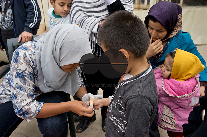 Volunteer doctor treating refugees from Syrian and Afghnanistan in Ãesme, near Izmir, Turkey. They are all waiting to cross to Greece to seek settlement in Germany.