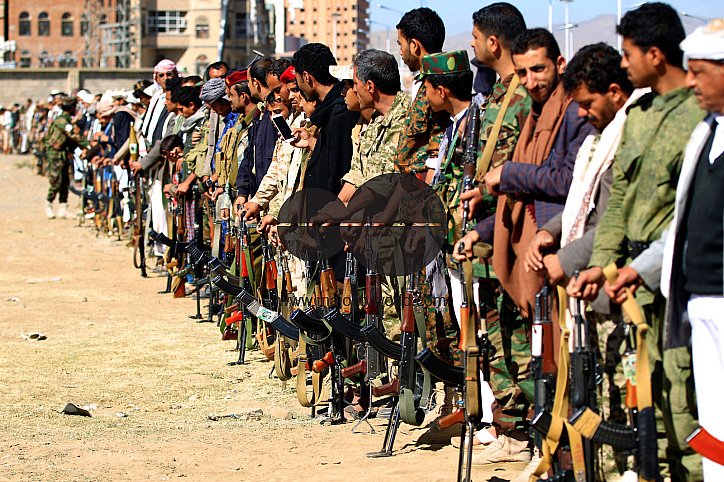 • Description: Armed Yemeni men hold their weapons as they gather in the capital Sanaa to show their support to the Shiite Huthi movement against the Saudi-led intervention, on December 19, 2018.
