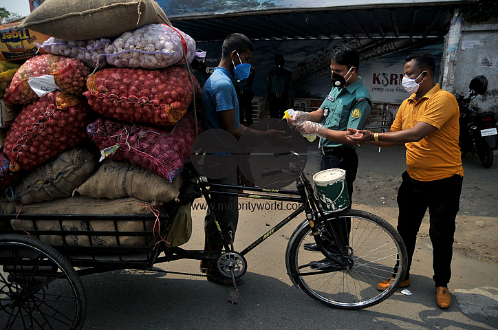 March 26, 2020 Sylhet, Bangladesh: Sylhet Metropolitan Police rising awarness and providing sanitizer among to mass people as a precautionary measure against the spread of the COVID-19 in the street of Sylhet, Bangladesh.
