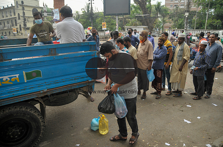 April 02,2020 Sylhet, Bangladesh: People buying soybean oil and other food at low price rate from Trading Corporation of Bangladesh a government authorized company for amid COVIC-19 lockdown in Sylhet, Bangladesh.