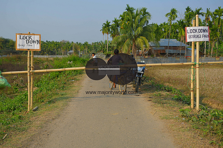 AGARTALA,TRIPURA,INDIA, 27-03-2020 :People are crossing the bars , to enter , the Bairagi Para ADC Villages , as the people of Bairagi Para , have decided , during this Coronavirus threat and Lockdown, they will not allow any new person to their village. And the local people , who are going and coming to the village for their daily needs, have to wash their hands before entaring their village. So, in the entrance of Bairagi Para, they kept no entry and lockdown bords and also arranged a bucket of water and soaps, as people have to wash their hands , when they will enter.                          Bairagi Para , is an ADC Village, Subdivision -Sidhai and Block - Hazamara . The village is 50 km far from Agartala, capital of the Northeastern state of Tripura, India. PHOTO BY-ABHISEK SAHA